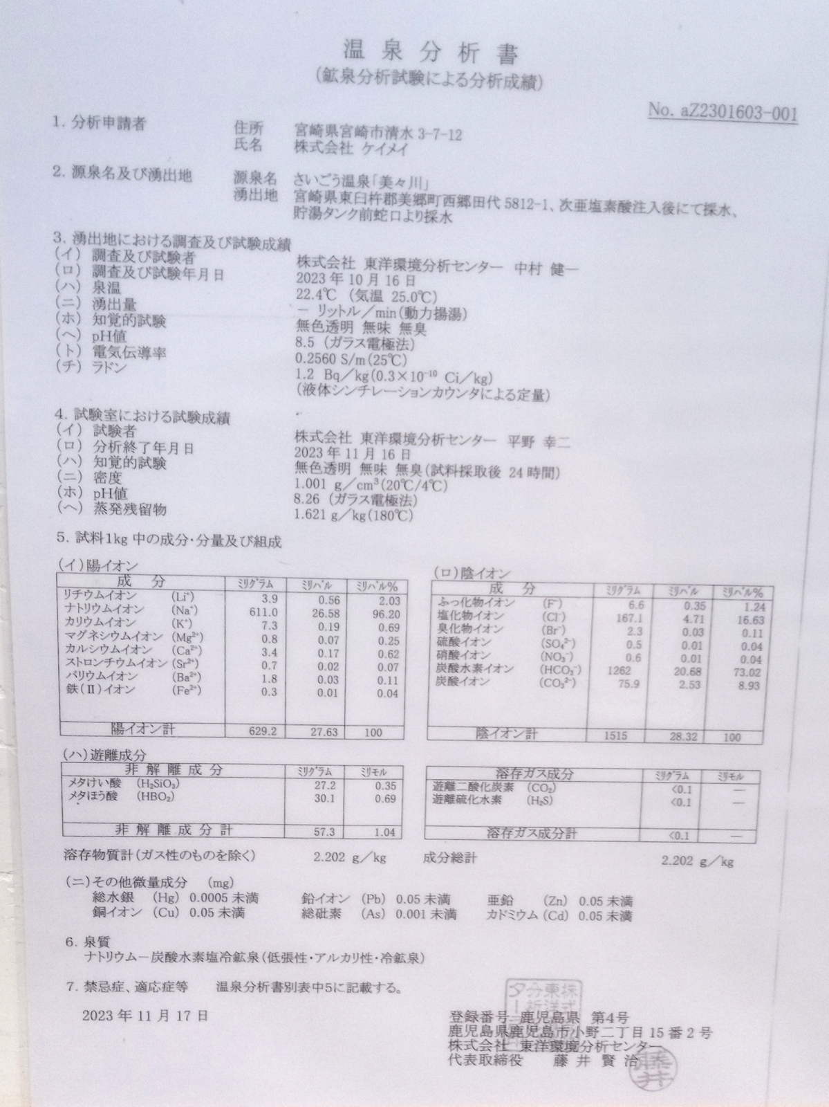 温泉分析書 / 宮崎リゾート温泉(旧:大淀河畔温泉) たまゆらの湯